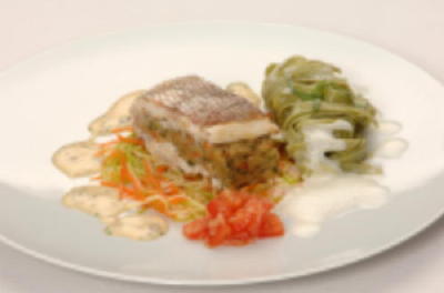 Die Dorade portionieren und auf den Gemüsejulienne anrichten, die Nudeln mit einer Fleischgabel aufdrehen und mit den geschmolzenen Tomaten anlegen, mit dem Austernsabayonne umgießen