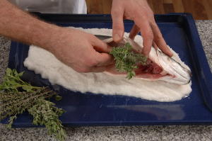 -Innen und außen pfeffern und die Kräuterzweige sowie Zitronenstücke in die Bauchhöhle geben