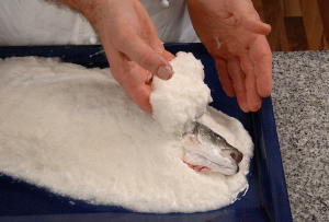 -den Fisch darauf setzen und mit dem restlichen Salz bedecken, gut andrücken