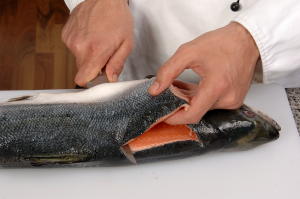 4) Fett und Bauchlappen entfernen. Gräten mit einer Grätenzange in Wuchsrichtung ziehen.