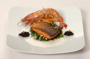 Heißgeräucherte Lachsschnitte auf Pinienkern-Blattspinat mit einem Krustentier-Vanilleschaum