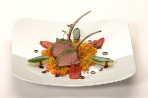 Gemüse in die Mitte des Tellers geben und Lammkarree darauf setzen. Rotweinreduktion dazu reichen.