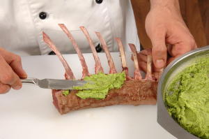 Die Kräutermasse auf die Oberseite des Karrees streichen und im Ofen bei 85 Grad ca. 35 min. garen. Die letzen fünf Minuten mit starker Oberhitze gratinieren.